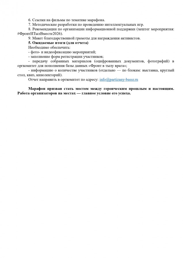 «Марафон призван стать мостом между героическим прошлым и настоящим. Работа организаторов на местах – главное условие его успеха», – подчёркивается в рекомендациях.