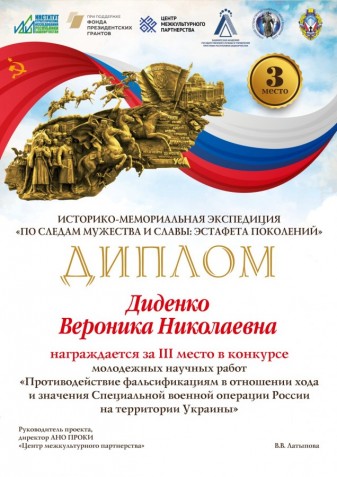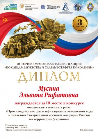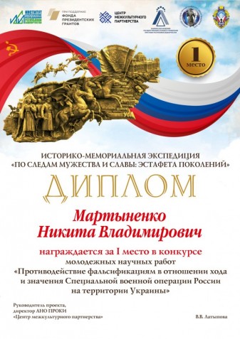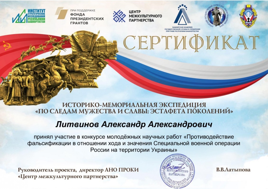 Именно поэтому в рамках проекта «Историко-мемориальная экспедиция «По следам памяти и славы: эстафета поколений» при поддержке Фонда президентских грантов с 15 ноября 2022 года по 30 марта 2023 года прошел конкурс молодежных научных работ «Противодействие фальсификациям в отношении хода и значения специальной военной операции России на территории Украины