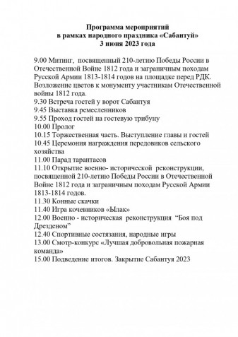 3 июня в Гафурийском районе в рамках народного праздника «Сабантуй» состоится Военно-историческая реконструкция «Бой под Дрезденом», посвященная 210-летию освобождения Русской армией Европы от наполеоновского господства. Начнется мероприятие с митинга и возложения цветов к монументу участникам Отечественной войны 1812 года в с.Красноусольский.
