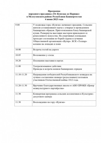 4 июня в Мелеузовском районе пройдет Народный праздник «От Кунгака до Парижа» у подножия горы Кунгак, откуда воины в 1812 году уходили на войну с Наполеоном. Праздник начнется с торжественного митинга и церемонии возложения цветов к стелле, посвященной воинам-участникам Отечественной войны 1812 года и зарубежных походов Русской армии 1813-1814 годов у д.Туманчино.