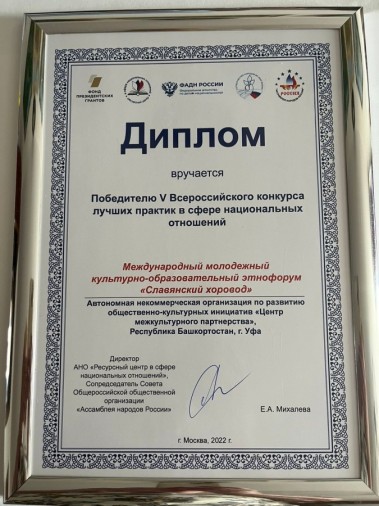 Проект «Международный молодежный культурно-образовательный этнофорум «Славянский хоровод» Автономной некоммерческой организации по развитию общественно-культурных инициатив «Центр межкультурного партнерства» (Республика Башкортостан) вошел единственным в число победителей в номинации «Лучшие практики в сфере народной дипломатии».