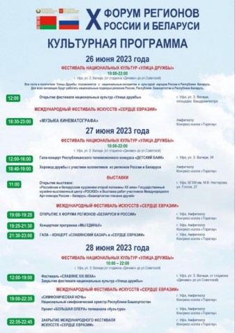 В рамках форума пройдут деловые встречи, подписание соглашений, выставки, пленарное и секционные заседания Конгресса регионов России и Беларуси, яркие молодежные, спортивные и культурные мероприятия, концерт «Славянский базар в Сердце Евразии».