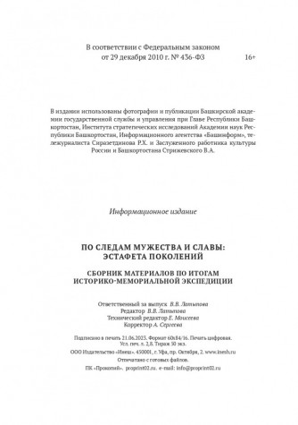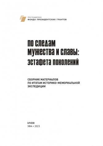 В сборнике представлены материалы по реализации проекта «Историко-мемориальная экспедиция «По следам мужества и славы: эстафета поколений». Использованы фотографии и публикации Башкирской академии государственной службы и управления при Главе Республики Башкортостан, Института стратегических исследований Академии наук Республики Башкортостан, Информационного агентства «Башинформ», тележурналиста Сиразетдинова Р.Х. и заслуженного работника культуры России и Башкортостана Стрижевского В.А.