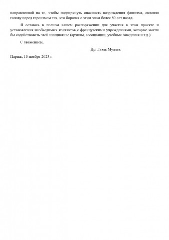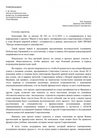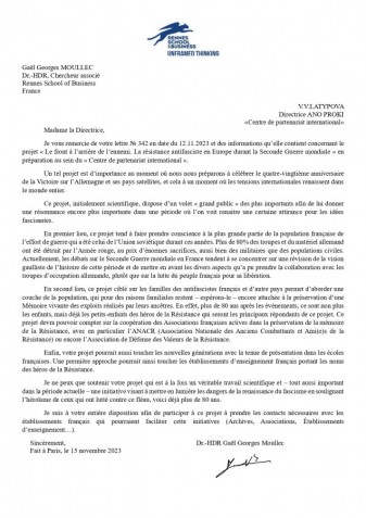 Профессор, ассоциированный исследователь бизнес-школы в г.Ренн Франции Гаэль-Жорж Муллек в ответ на вопрос АНО ПРОКИ «Центр межкультурного партнерства» об отношении французской общественности к празднованию 80-летия Победы во Второй мировой войне, востребованности во Франции восстановления истории участия жителей СССР и Франции в Движении Сопротивления, выявления сведений об участниках подпольного антифашистского движения в архивах России и Франции и нахождения их родственников в России и Франции, установлении контактов между образовательными учреждениями России и Франции в процессе этой деятельности, отметил большую научную и общественную значимость предлагаемого проекта.