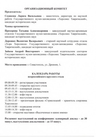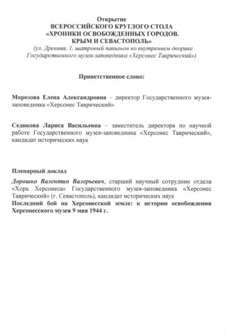 6 мая 2024 года на базе Государственного историко-археологического музея-заповедника «Херсонес Таврический» в рамках работы выставки «Высеченные в камне имена» к 80-й годовщине освобождения Крыма и Севастополя в годы Великой Отечественной войны пройдет всероссийский круглый стол «Хроники освобожденных городов. Крым и Севастополь».