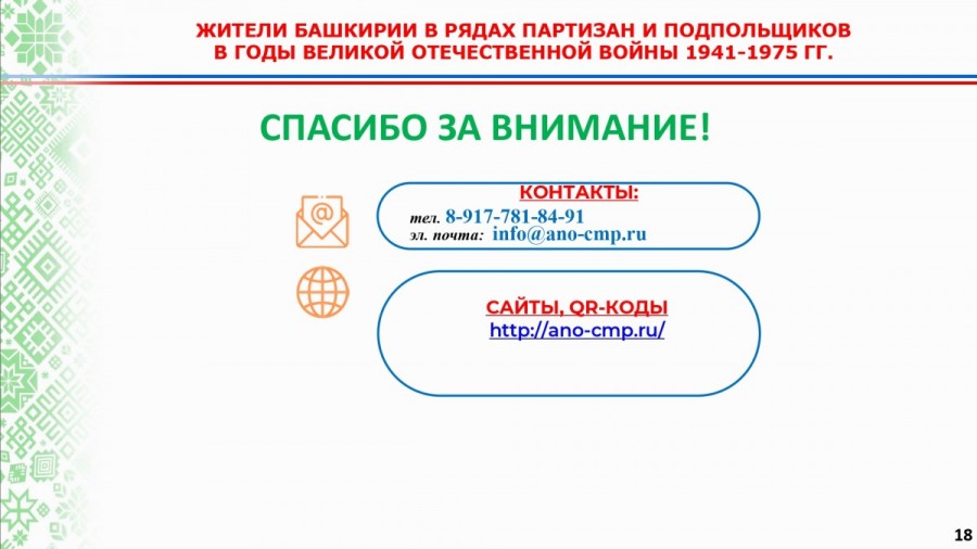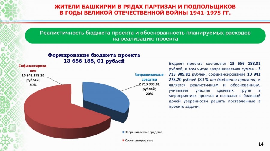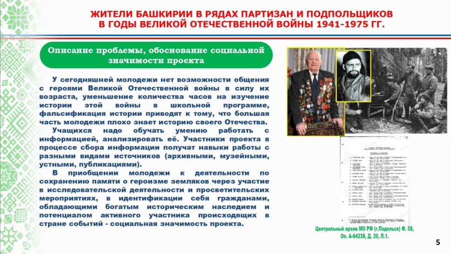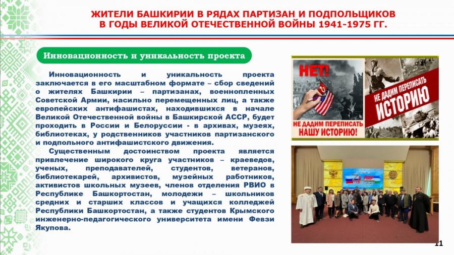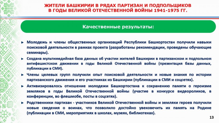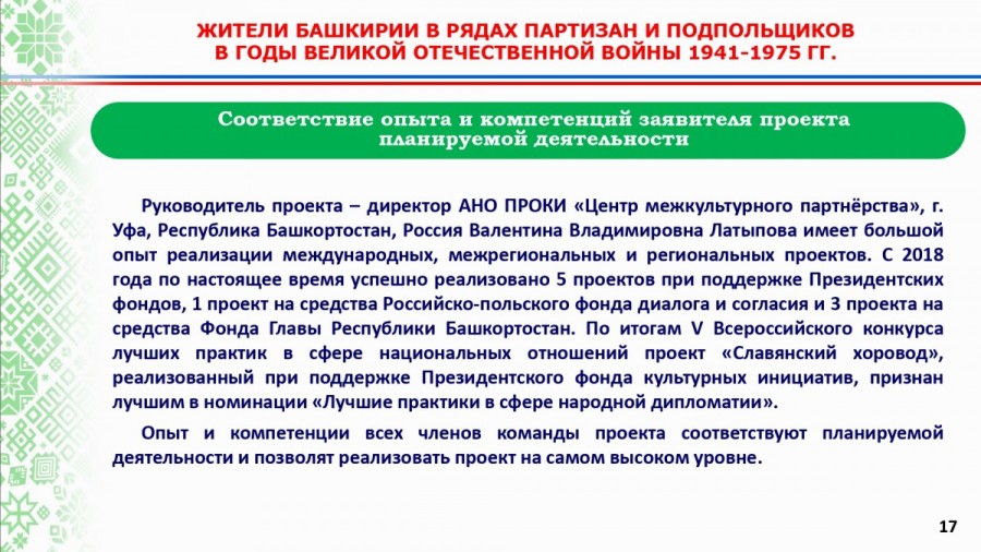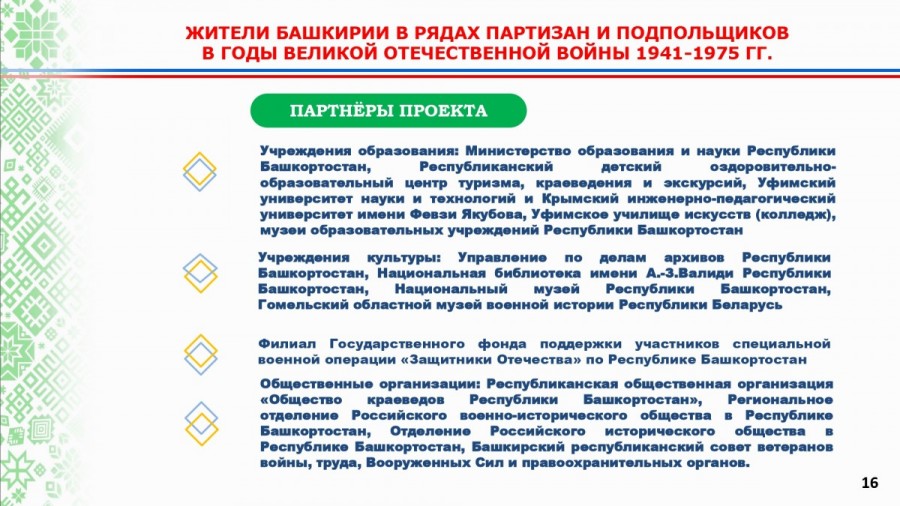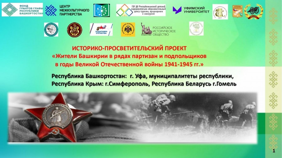 Историко-просветительский проект «Жители Башкирии в рядах партизан и подпольщиков в годы Великой Отечественной войны 1941-1945 гг.» стал победителем в первом конкурсе на предоставление грантов Главы Республики Башкортостан