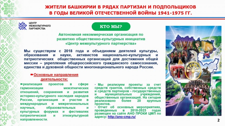 Автономная некоммерческая организация по развитию общественно-культурных инициатив «Центр межкультурного партнёрства» вошла в число победителей первого конкурса на предоставление грантов Главы Республики Башкортостан некоммерческим неправительственным организациям Республики Башкортостан, участвующим в развитии институтов гражданского общества и реализующим социально значимые проекты в 2024 году с Историко-просветительским проектом «Жители Башкирии в рядах партизан и подпольщиков в годы Великой Отечественной войны 1941-1945 гг.».