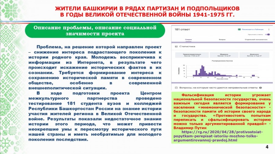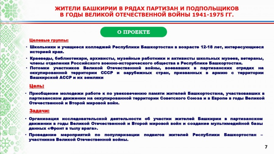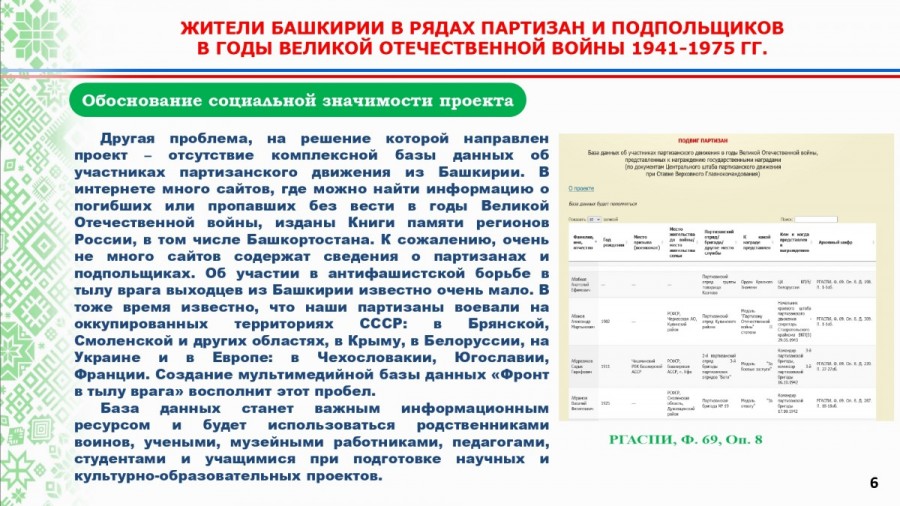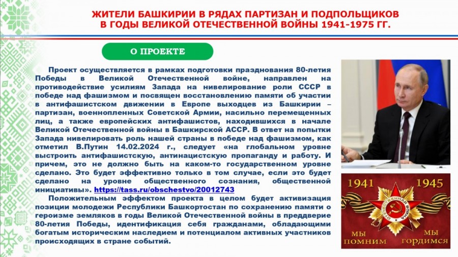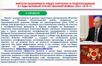 Созданный в рамках общественной инициативы в ходе подготовки празднования 80-летия Победы в Великой Отечественной войне проект направлен на увековечение памяти жителей Башкирии, участвовавших в годы войны в партизанском движении на оккупированной территории Советского Союза и в Европе через создание мультимедийной базы данных «Фронт в тылу врага» с участием молодежи и общественников.