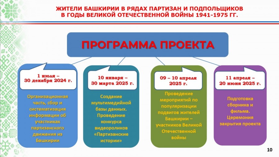 Проект состоит из 3-х блоков: сбор и систематизация информации об участниках партизанского движения из Башкирии, создание структурированной базы данных и проведение мероприятий по популяризации подвигов жителей Башкирской АССР – партизан - участников Великой Отечественной войны. Много наших земляков воевало в партизанских отрядах Белоруссии и Крыма. Именно поэтому в сборе информации о них примут участие группы исследователей из этих регионов.
