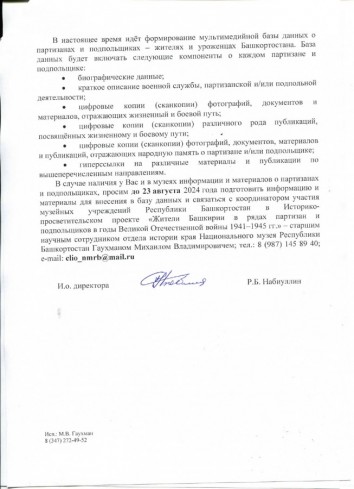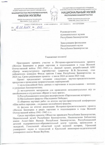 - Национальный музей Республики Башкортостан выступает одним из основных организаторов проекта и предлагает региональным и муниципальным музеям Республики Башкортостан принять участие в проекте и, в случае наличия в музеях информации и материалов о партизанах и подпольщиках, до 23 августа 2024 года подготовить информацию и материалы для внесения в базу данных. Координатором участия музейных учреждений Республики Башкортостан в Историко-просветительском проекте «Жители Башкирии в рядах партизан и подпольщиков в годы Великой Отечественной войны 1941–1945 гг.» является старший научный сотрудник отдела истории края Национального музея Республики Башкортостан Гаухманом Михаилом Владимировичем; тел.: 8 (987) 145 89 40; e-mail: clio_nmrb@mail.ru.