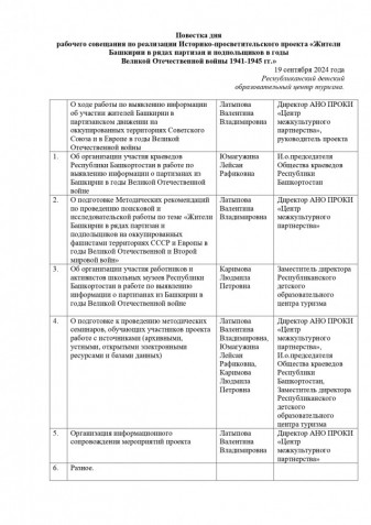 19 сентября 2024 года в Республиканском детском образовательном центре туризма (г. Уфа, ул. Гоголя 34) прошло 2-е совещание по реализации Историко-просветительского проекта «Жители Башкирии в рядах партизан и подпольщиков в годы Великой Отечественной войны 1941-1945 гг.».